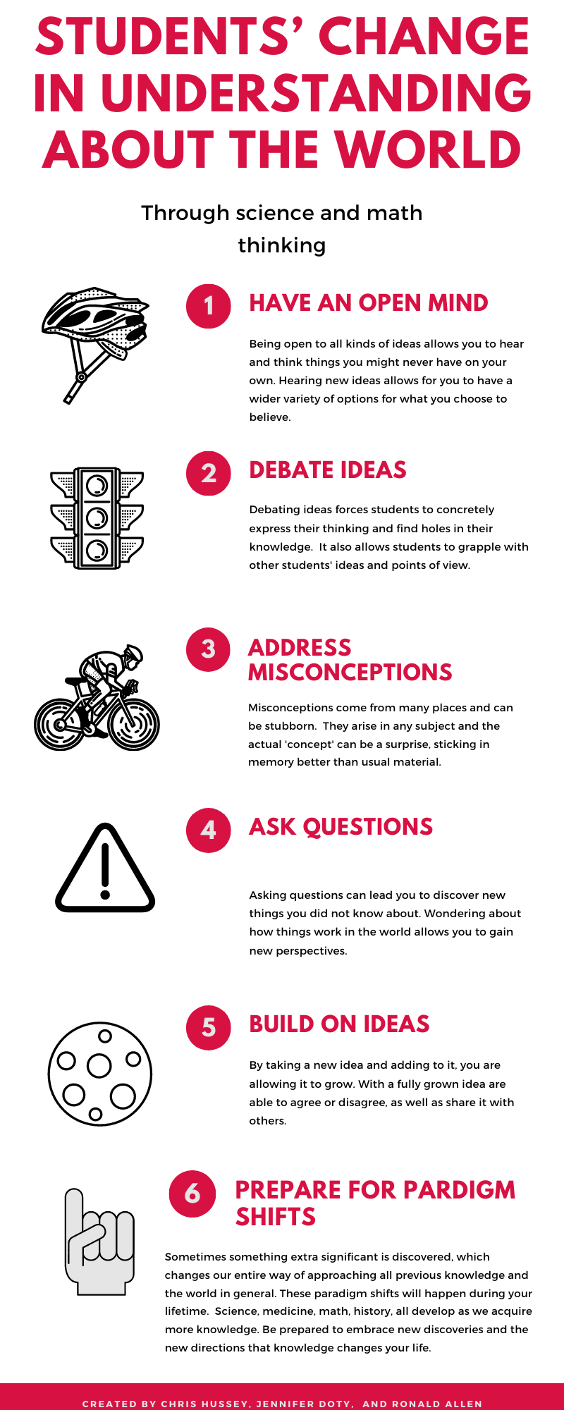 Students’ understandings about/to change the world: Students can change their ideas about the world (or change aspects of their worlds) through participating in scientific practices and applying mathematical reasoning.
