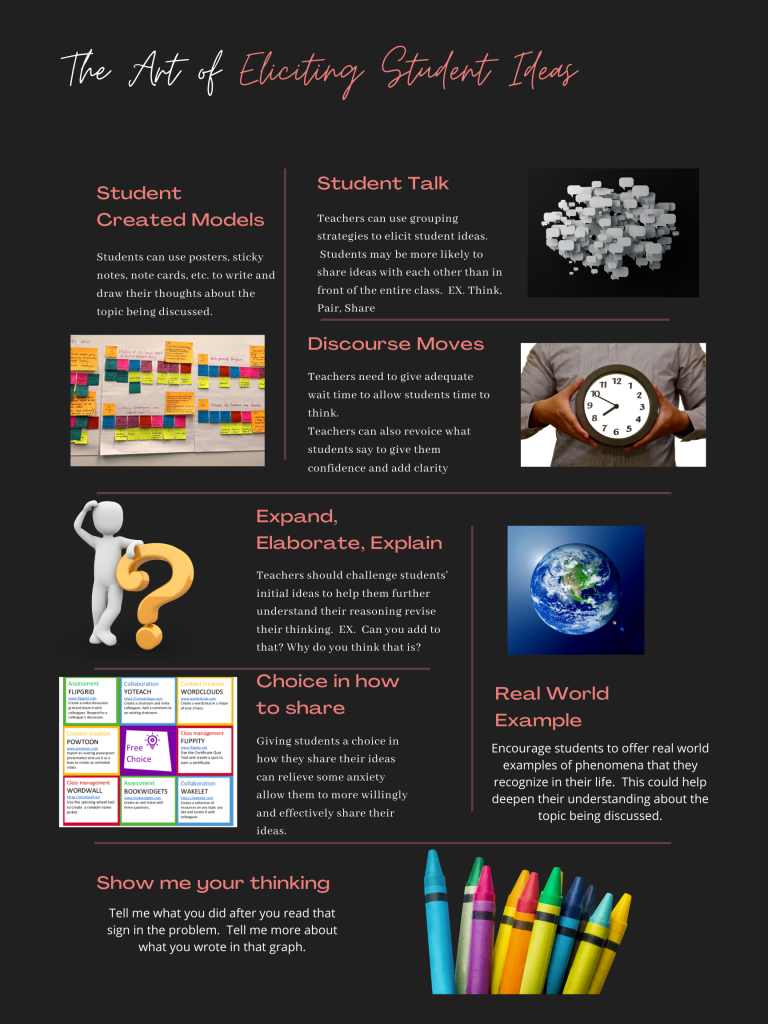Eliciting students’ ideas/thinking: You can use a range of discourse moves and assessment strategies to understand students’ initial ideas about the math and science concepts you are teaching to help you use their ideas as resources in your classroom.