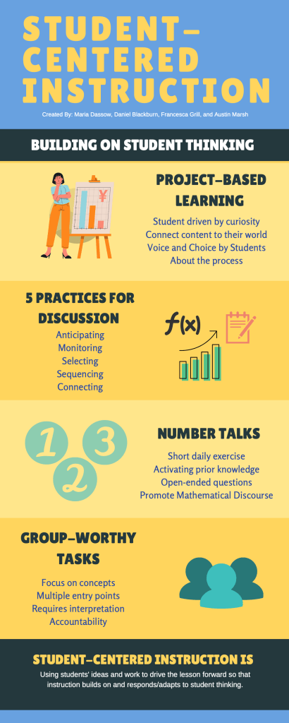 Student-centered instruction: You can use students’ ideas and work to drive the lesson forward so that instruction builds on and responds/adapts to student thinking.