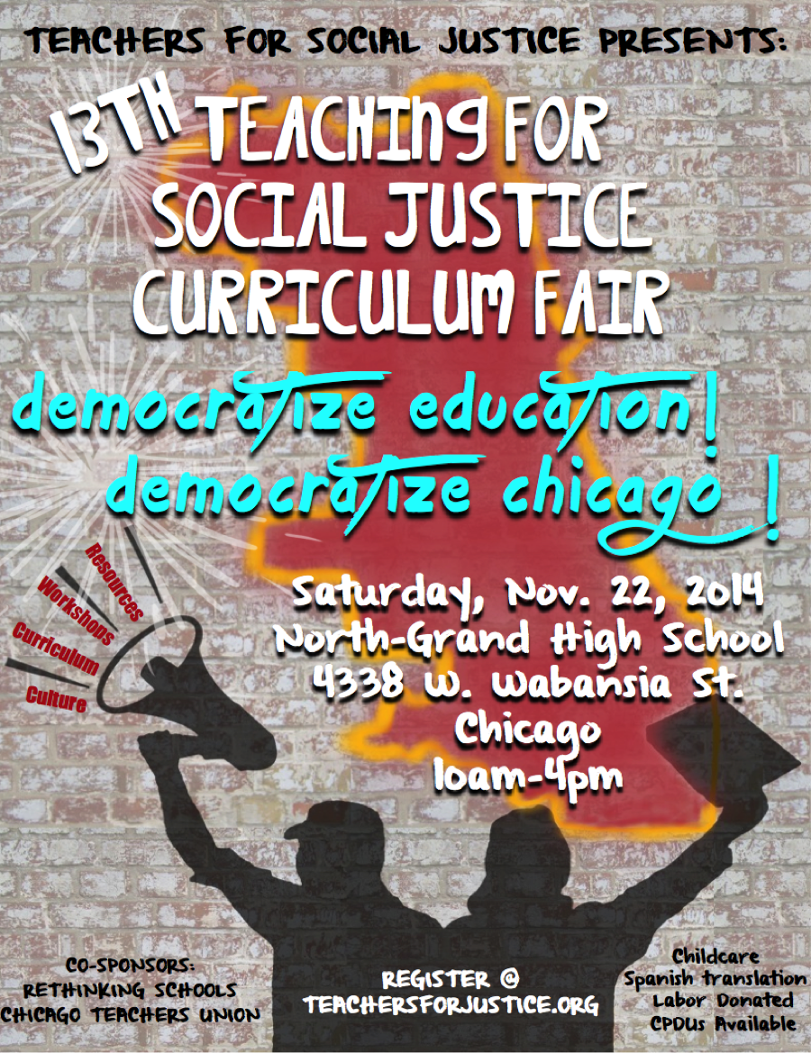 Events Teachers for Social Justice Curriculum Fair Date: October 7, 2014Author: franceskharper 0 Comments For anyone who happens to be near Chicago, this is a great opportunity to connect with other educators working for social justice. Share this: Click to share on X (Opens in new window) X Click to share on Facebook (Opens in new window) Facebook More Click to email a link to a friend (Opens in new window) Email Click to share on LinkedIn (Opens in new window) LinkedIn Click to share on Pinterest (Opens in new window) Pinterest Like Loading... Related