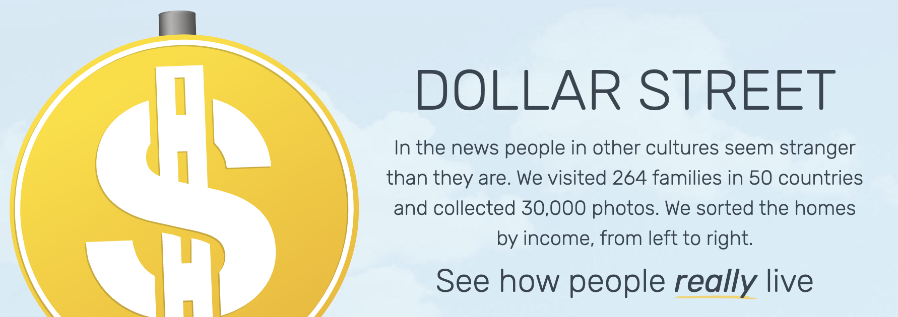 Data as art for connection at scale. I also just read an email from a colleague from Michigan State, Brittany Dillman. Dr. Dillman wrote to share a resource that made her think of this site because of the potential for teaching mathematics for social justice. The website: Dollar Street — photos as data to kill country stereotypes — greets you with this pop-up:
