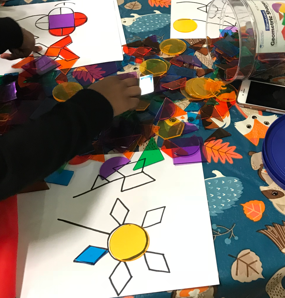 Students use geometric shapes to create flower patterns, like florists at a local flower shop.