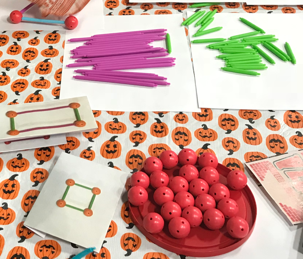 Using the Geometric Shapes Building Set, children make a 2D or 3D geometric structure or shape (e.g. square pyramid, cube, triangle, square, pentagonal pyramid, etc.). They then determine how many vertices and edges their structure has.
